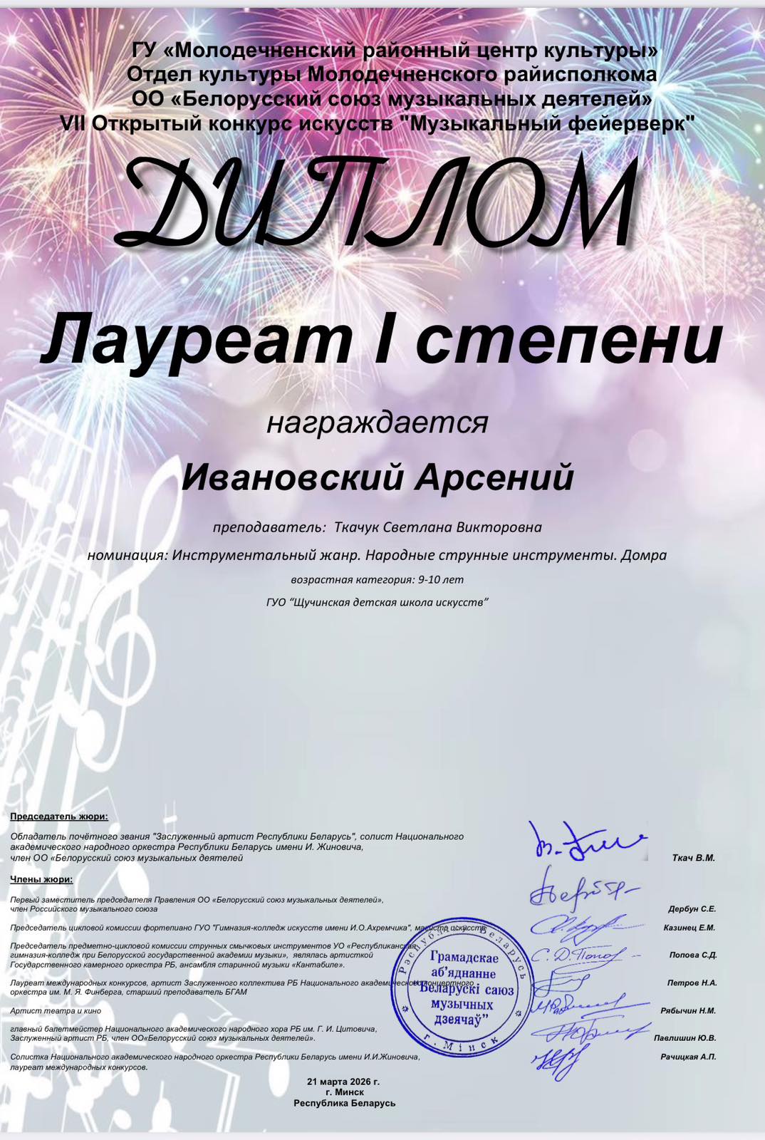 IV Открытый республиканский разножанровый конкурс «Жарынка-2026». Ивановский Арсений-Лауреат II степени (учитель Ткачук С.В, концертмейстер Голышева С.Н.)