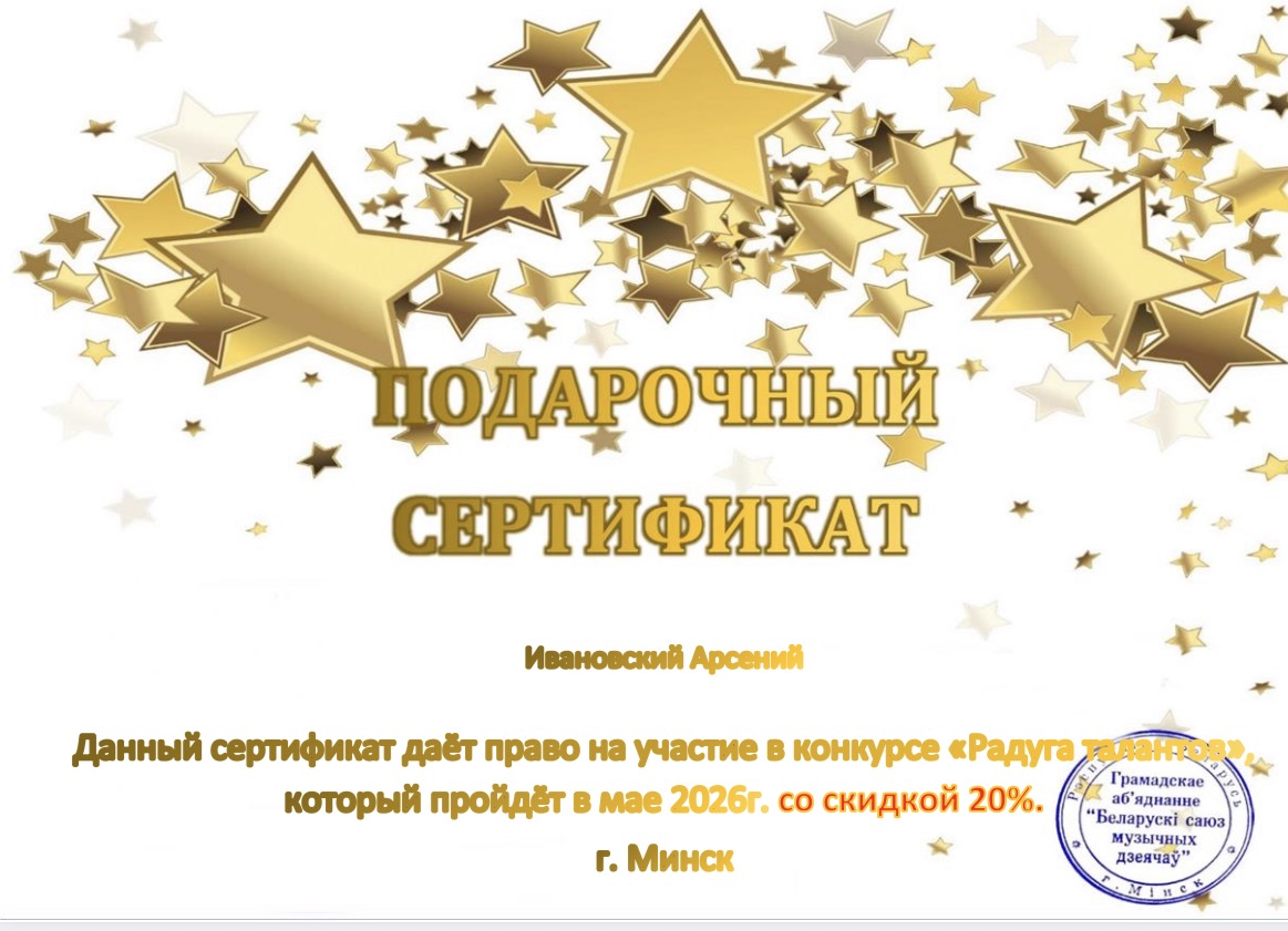 Поздравляем Арсения с успешным выступлением и подарочным сертификатом на следующий конкурс.