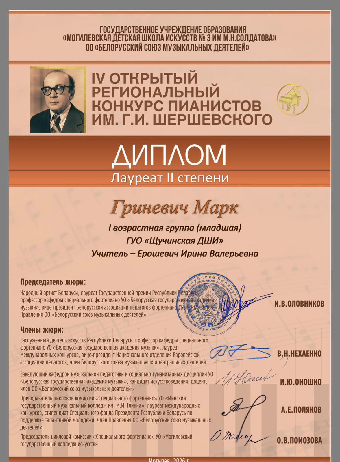 20 марта 2026 года в государственном учреждении образования «Могилевская детская школа искусств №3 им.М.Н.Солдатова» прошел IV Открытый региональный конкурс пианистов им. Г.И.Шершевского. В нем приняли участие учащиеся специализированных и музыкальных школ Председателем жюри был приглашен Игорь Владимирович Оловников – народный артист Беларуси, лауреат Государственной премии Республики Беларусь, профессор Белорусской государственной академии музыки и. Был отмечен высокой уровень подготовки юных пианистов.
